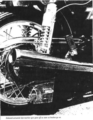 To get an accurate indicator of where each bike’s brakes were applied each time, an electrically-actuated dye marking gun was fitted to a rear shock absorber. The brake light switch was disconnected from its light and wired to the gun. Brakes go on, gun goes off. On each test, the speed was recorded from the timer, and the distance from the dye mark on the pavement to the gun on the stopped motorcycle was measured carefully.