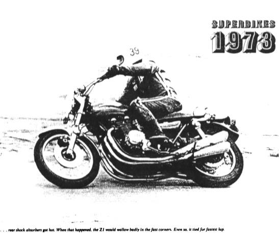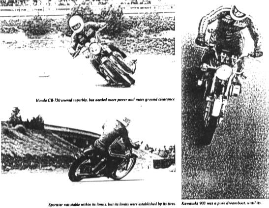 Being able to run a fast bike to its limit on a closed circuit is an enlightening, rare, re-leasing experience. No oil, rocks, dogs, cars, cops or paperboys to worry about around the next bend in the road. Just you and the machine. After the course is learned roughly (you know which direction the next turn takes), your choice of path gets narrower each lap as you learn where you have to be in order to not have to ease the throttle or get on the brakes. If the suspension springs have rates high enough and their movement is correctly controlled by shock absorbers and there are good tires on the bike, you will soon find the cornering limit. Foot rests, mufflers, or stands are usually the first things to touch down.