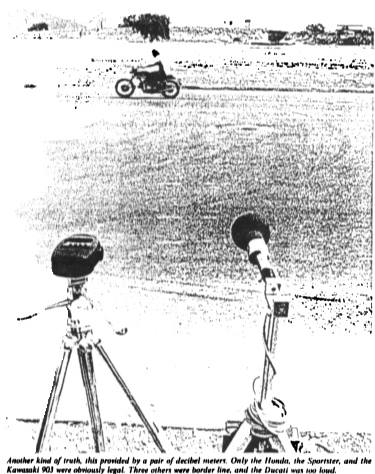While we have explicit faith in the accuracy of our own General Radio sound-level measuring equipment, we called upon the corporation of Bolt, Beranek, and Newman (an outfit that does sound-level work for the MIC) to assist us in this part of the test. We asked for their help for two reasons: we wanted our results to be accurate beyond a shadow of a doubt since we felt that several of the motorcycles in the test would be if not illegal, damn close to it; and we wanted the representatives of the manufactures involved to be without argument or recourse should our results cause them discomfort. As a double-check we located our own meter right next to BBN’s apparatus. Both meters gave identical readouts on all the motorcycles tested.