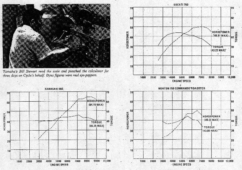 As in every other category so far, the Kawasakis swept the horsepower race with the 750 on top at 64.52 at 6555 rpm and the 903 just a flash behind—64.15 at 8440 revs. These figures are 11 horses above the third-place Triumph (53.40 hp). It was nearly a tie for the fourth, fifth, and sixth spots between the Ducati (49.61), Norton (49.66) and Honda (49.61). Severely restricted by its California mufflers, the Sportster bottomed out with 46.50 hp at 5724 rpm.