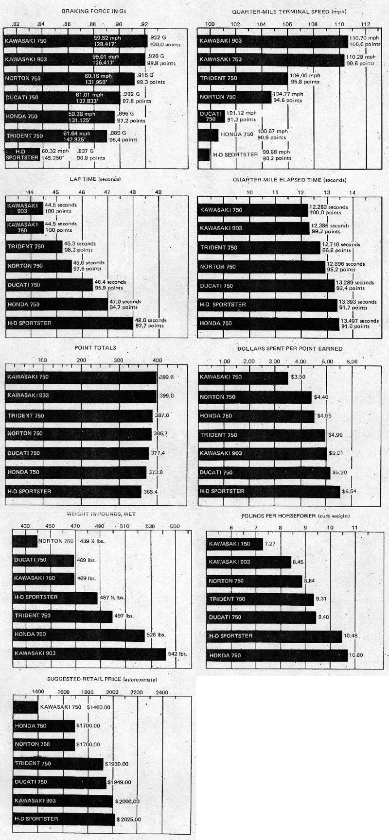 And last is the Sportster with 365.4 points, shoving forth its image and hiding its performance figures. The Sportster and the Kawasaki 750 are the last two legitimate, old-time Superbikes; every other participant had evolved beyond the 1970 definition, and even the Mach IV shows signs of civility. The Sportster is to be praised for its noise control; but for a bike that demands the considerations that Superbikes used to be entitled to it delivers rather shoddy absolute performance, and what performance it does deliver comes at a pretty high price—the XLCH was the most expensive bike in the test. For every point earned, it charges $5.54. The Kawasaki only charges $3.50.