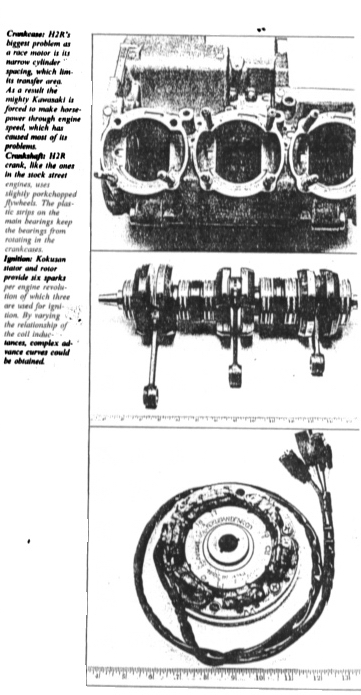 While street 500’s had the radical new battery/inverter CDI (Capacitive Discharge Ignition), the racer used a points system more familiar to mechanics at that time. In 1971, the H1-RA’s pioneered a magneto-type CDI of clever design, incorporating a complex advance curve. The direct descendant of this system fires the H2-R, and street 750’s are equipped with CDI, though of a different type.