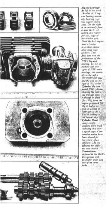 The H1-R cranks had run as long as 1500 miles in 1970, but in 1971, mysterious troubles ruined crank after crank. Another approach to strengthening the cages was tried, reducing the number of rollers from eighteen to thirteen, with one per slot. This was stronger than the street design, with fourteen rollers, and it didn’t have two rollers rubbing each other the wrong way. It was very successful, and the design was enlarged for the H2-R.