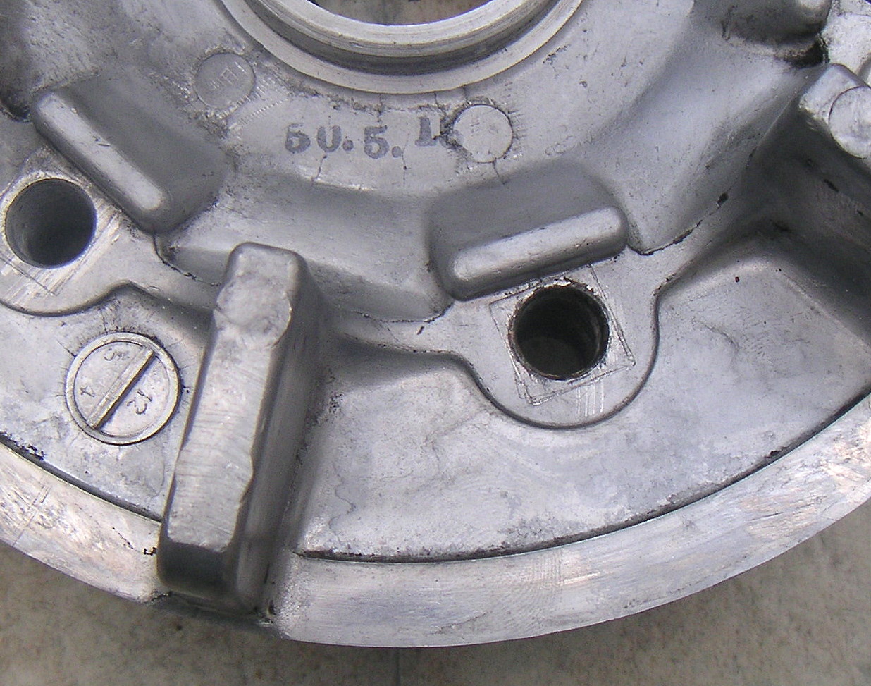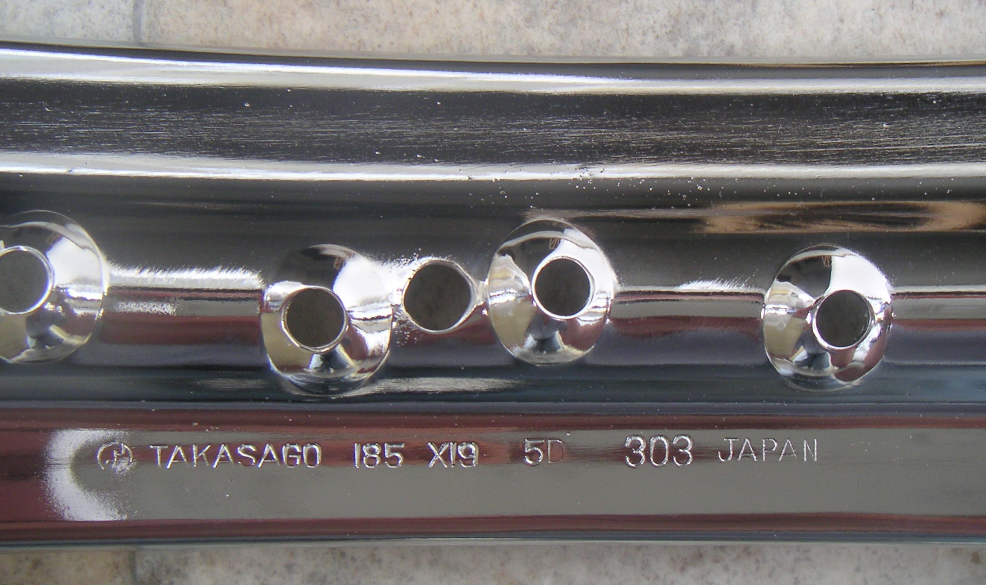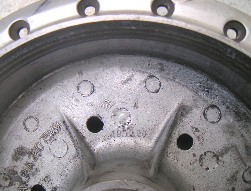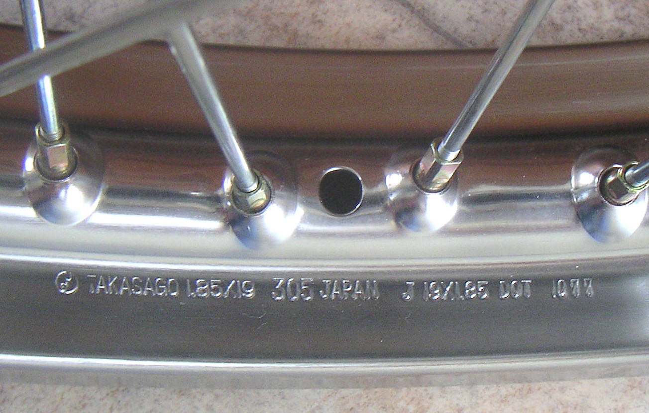 Up until 1976, these parts use a Numeric/Alpha code based on Gregorian date. The number relates to year (with the first number dropped). For example 4 = 1974. The letter relates to the month running from ‘A’ for January, 'B' for Feb thro to 'L' for December. The first rim shown is ‘5D’ and is April 1975 fitted to a bike manufactured in May 1975. The second picture shows Takasago moving to a more conventional MM YY format. This rim is stamped 1077 and is therefore of October 1977 manufacture. It is the rim fitted to the hub shown above and clearly ties in with the date of the hub.